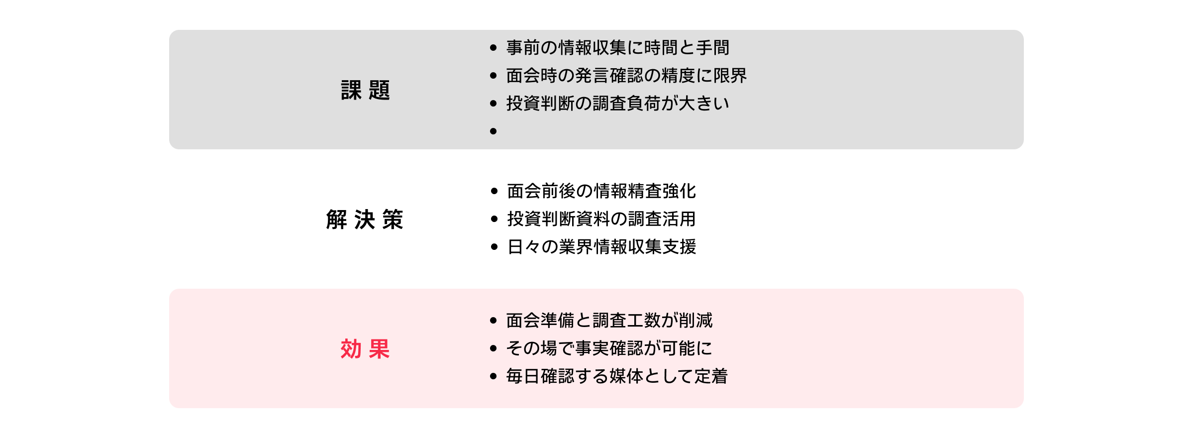 柴田様:スピーダの重要性が増しているのは、投資委員会で投資判断をくだす時です。各マネージャーが委員に配布する基礎資料をスピーダの情報も用いて作ります。その資料を基に、「このマーケット本当にとれるの?」「こんなマーケットあるの?」「競合を見ると、この業界はあまり期待できないよね」といった議論を重ね、投資枠50億の使い道が決まっていくわけです。